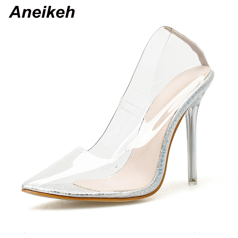 Aneikeh 2020 Concise Fashion PVC Woman Transparent Sandals Thin High Heels Shoes Pointed Toe Pumps